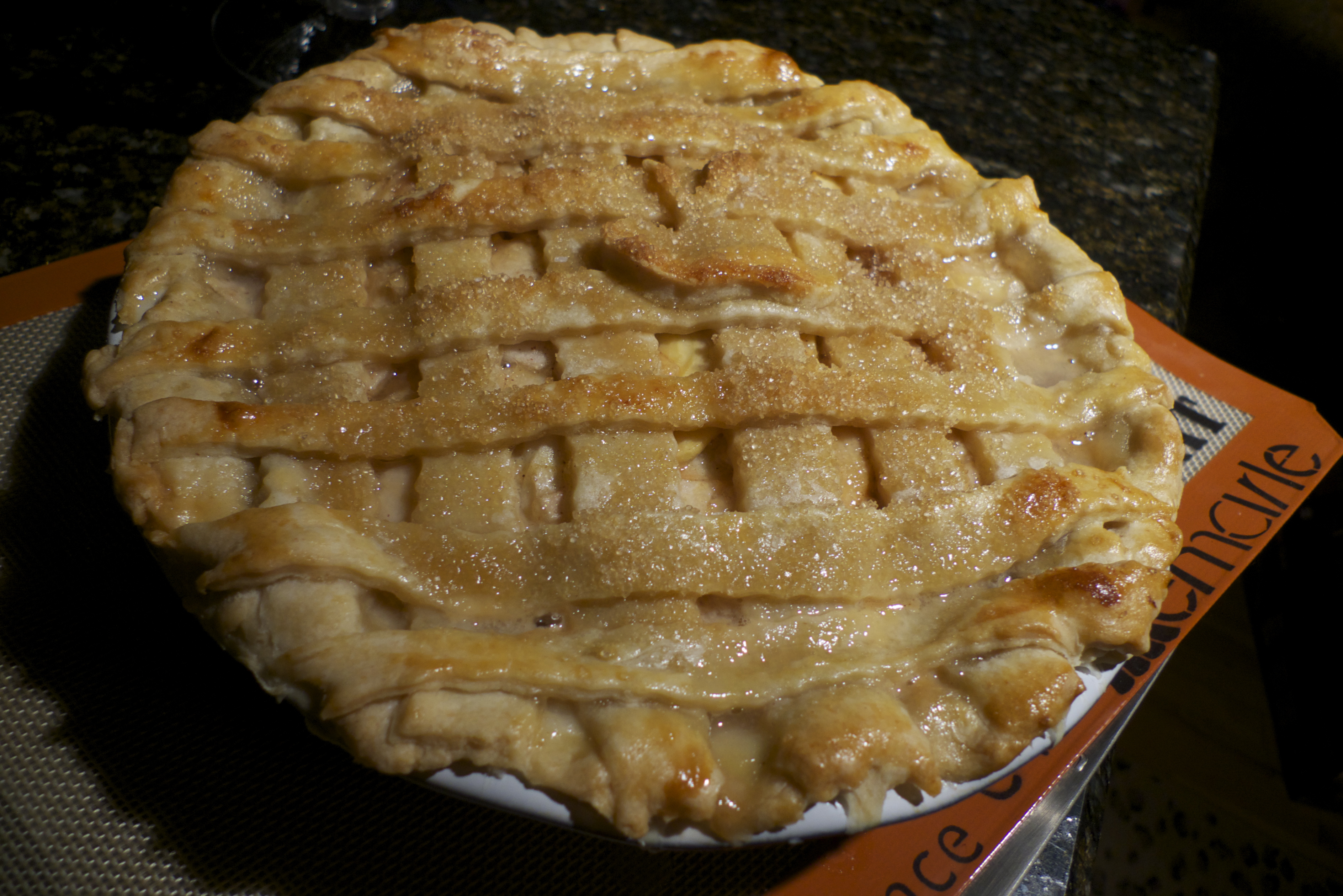 Place 1/3 of apple mixture into pie crust. Top with 1/3 caramel sauce. Repeat twice with apples and caramel. Create lattice with remaining pie dough and cut out apple shape if you wish. To lattice, you want to weave the pieces, which I did not do. It was my second lattice pie and I clearly forgot how to lattice appropriately. Brush with a beaten egg (to brown) and top with remainng caramel. Sprinkle raw sugar and sea salt flakes. Bake for 20 minutes at 375 degrees. Reduce temperature to 335 degrees and bake for an additional 25 to 35 minutes. Let pie rest for at least 30 minutes, but serve warm with ice cream or whipped cream.