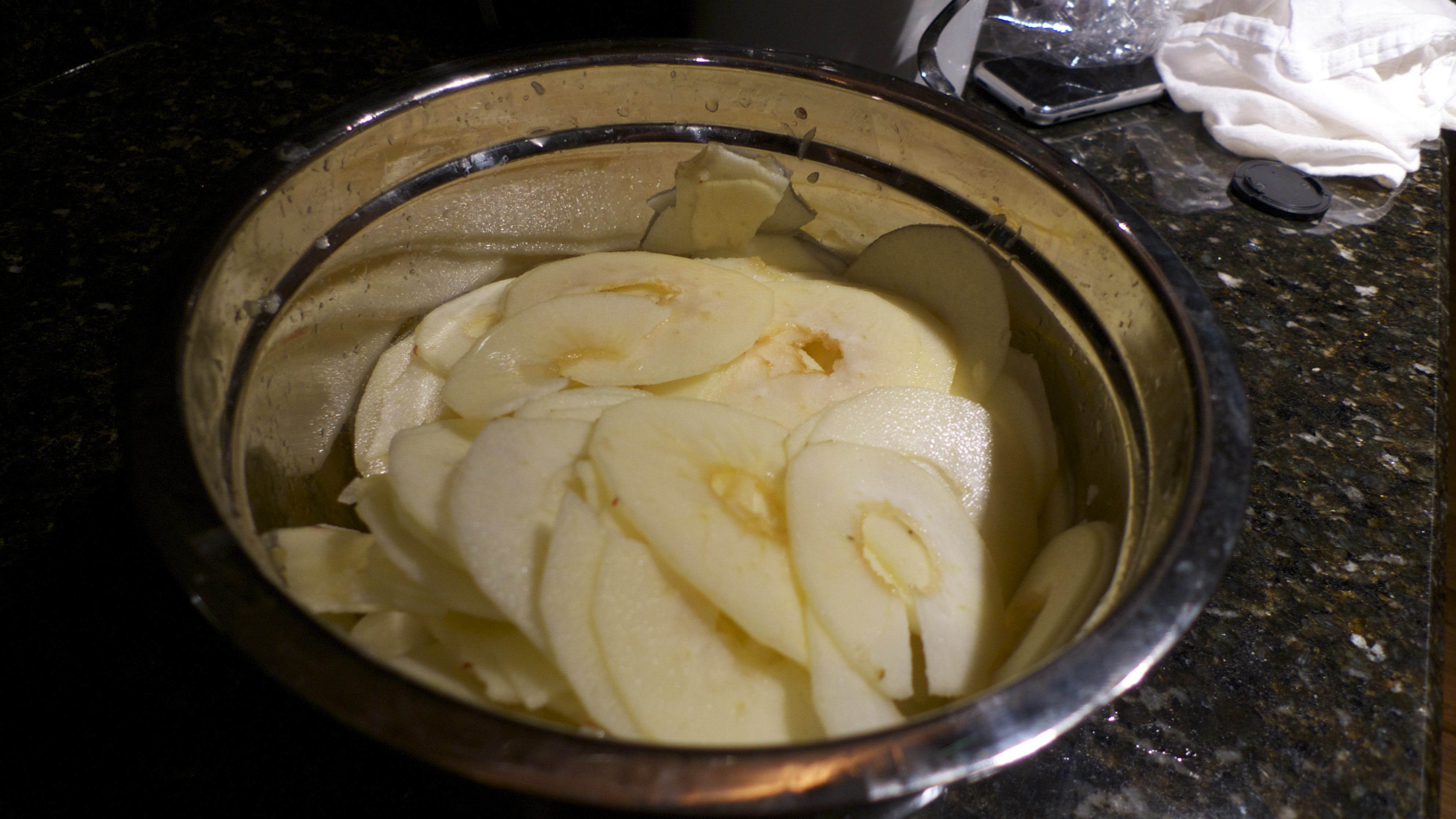 Squeeze lemons into a large bowl, but lose the seeds. Slice apples very thinly (a mandoline is suggested). Place apple slices in the bowl of lemon juice. Drain the apples and add flour mixture. Toss apples with your hands to coat evenly. Set aside.