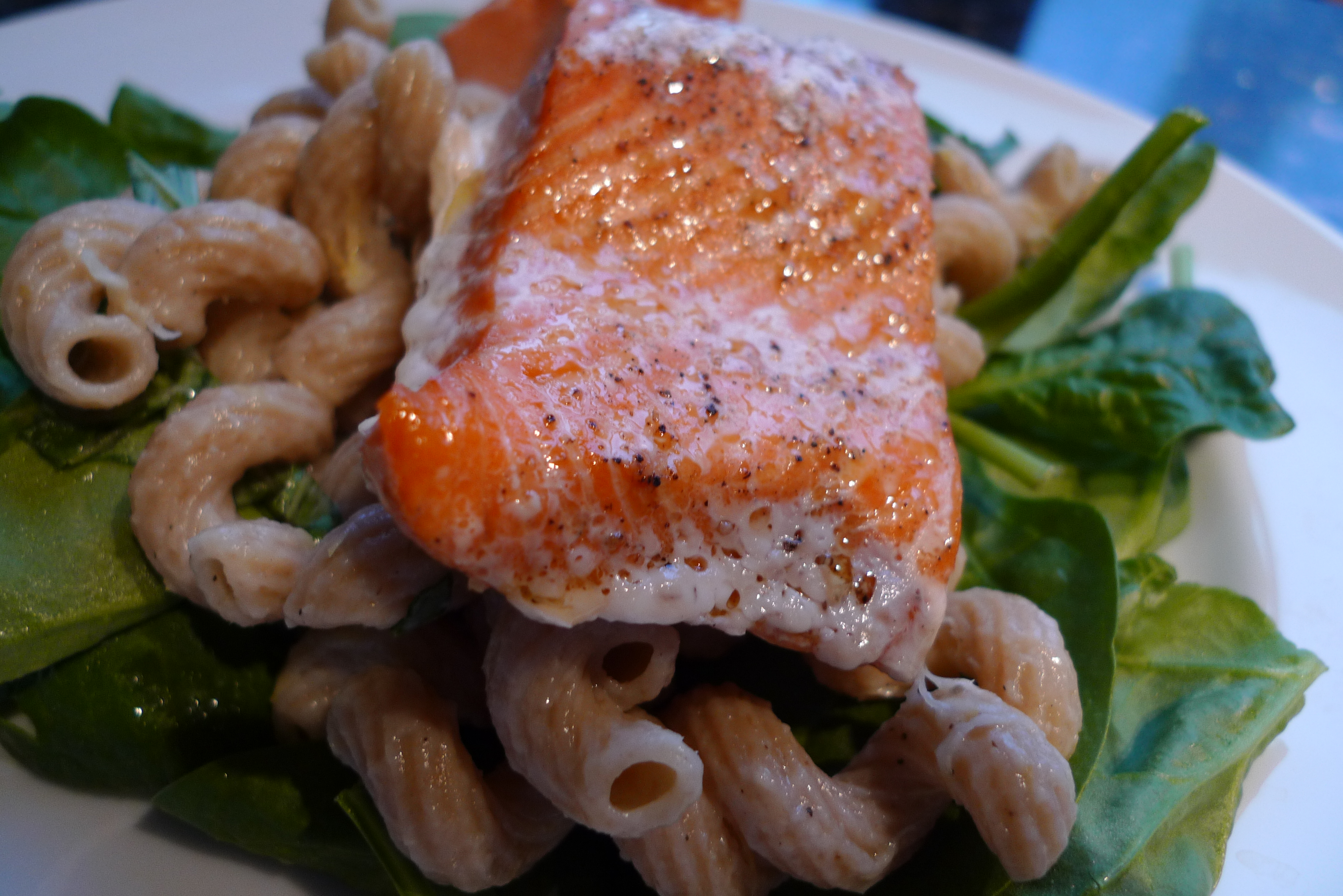 I meant to take more pictures of this dish, but within 15 minutes I was done and my memory kicked in at minute 16. I’m happy to have at least taken a few. A roasted (or grilled) piece of salmon is placed upon slightly tangy, citrusy pasta, atop a bed of fresh spinach.