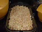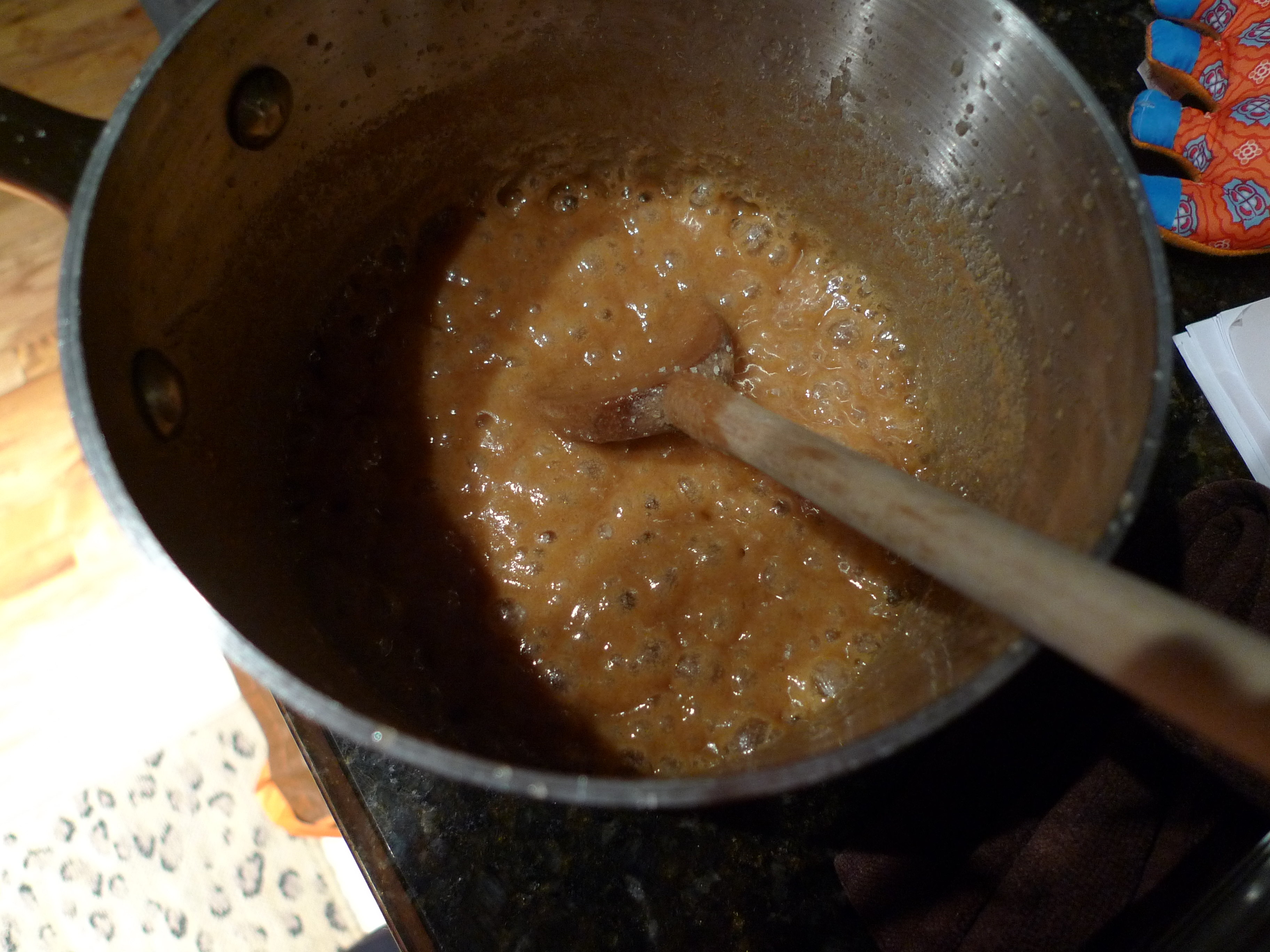 If you are making the caramel, take out an 8″ X 8″ glass baking dish. Your caramel will cool here. Dice butter into even sized cubes. Add sugar to a medium sauce pan and add 3 tablespoons water. Cook over medium heat until sugar is dissolved. Add butter and stir slowly until combined. Add corn syrup and half and half; mix.