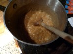 Cook and stir on medium for one minute, then to medium to high heat until boiling. Once boiling, clip on a candy thermometer. Reduce heat to medium and keep a steady boil, stirring occasionally. Watch the temperature – you want to reach 240 degrees. Remove from heat, add vanilla and salt and stir. Pour into baking dish and set aside.