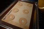 On a floured surface (and with a floured rolling pin), roll out dough in batches to 1/4 inch. Use a round (suggested – 1 1/2-inch) cookie cutter to cut out cookies. Place rounds on a cookie sheet lined with parchment or a silpat. I used a toothpick to hand draw inner circles, but you could use a smaller cookie cutter if you have one, or a wide straw. The cookies don’t expand so don’t worry that the hole is going to disappear.
