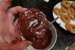 The topping will set quickly so you can get to work on the chocolate right away. Place chocolate in a small bowl and heat in the microwave for 1 minute. Take out and stir. Heat again for 30 second intervals until chocolate is completely melted. Most bits will melt just by mixing.