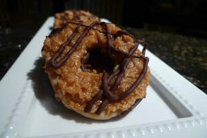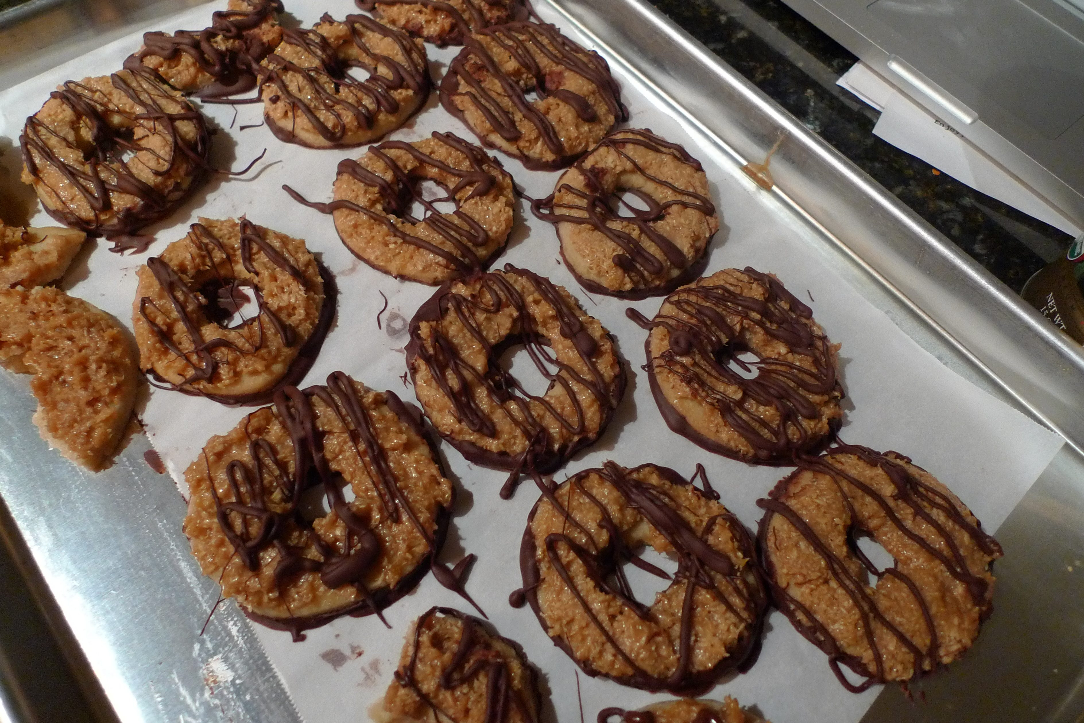 Samoa cookies are by far my favorite, but that isn’t to say I would shun a good Thin Mint or Tagalong. I was saddened when I was about to buy some ice cream (low-fat!) with Samoas mixed in, and saw partially hydrogenated fat on the ingredients list. I know food can be made without it, which led me to wonder why couldn’t I make Samoas myself? Which has brought us to this; a fabulous homemade Samoa cookie with all-natural ingredients.