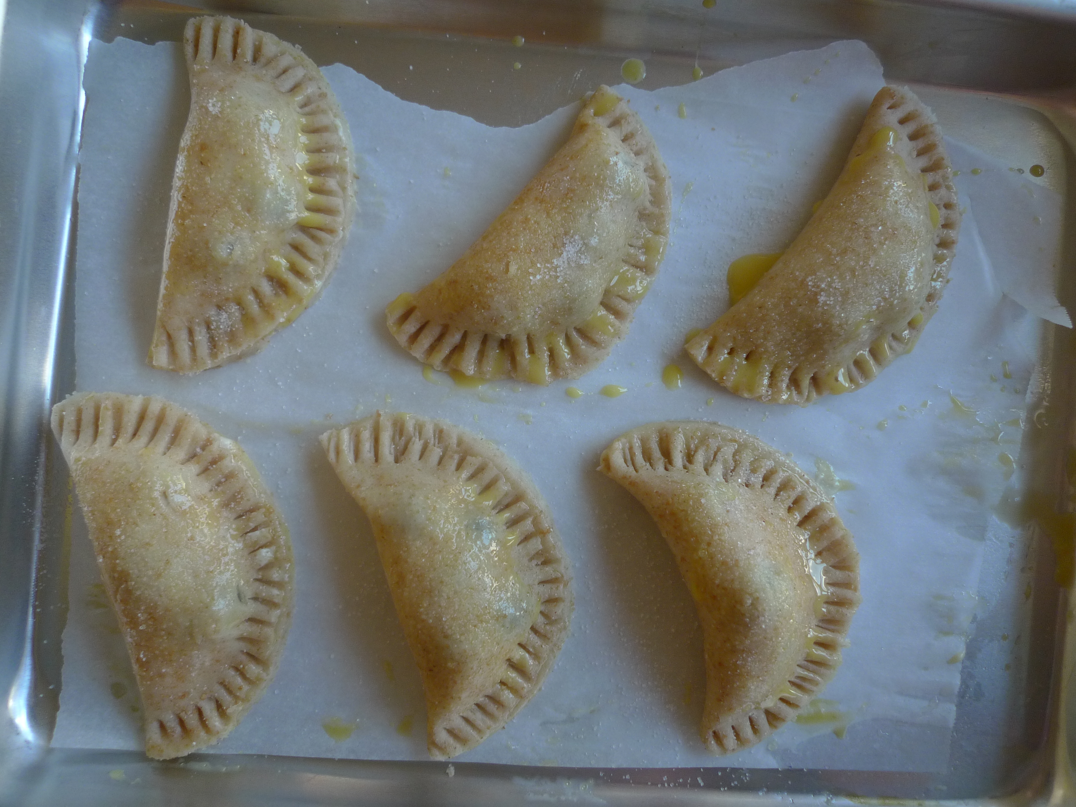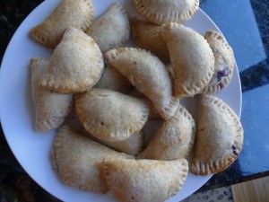 Roll out pie dough with a floured rolling pin to 1/8″ thickness. Using a large (something like a 3 1/2″) round cookie cutter, cut the dough into as many circles as you can. I had about 20 circles. Place the dough circles on the prepared baking sheet. Using a pastry brush, brush the edges of the dough circles with the beaten egg. Place about 1 1/2 teaspoons of the cheese mixture in the middle of the dough. Top with 3 blueberries or 3 to 4 pieces of diced peach. Fold the dough in half, enclosing the filling and press down on the edges to seal. Using a fork, gently crimp the sealed edges. Bake for about 20 minutes or until lightly browned. Repeat process with the rest of the pie dough. Let cool slightly; serve warm. Or piping hot. Or cold. They are good at every temperature.