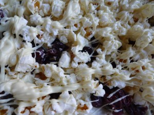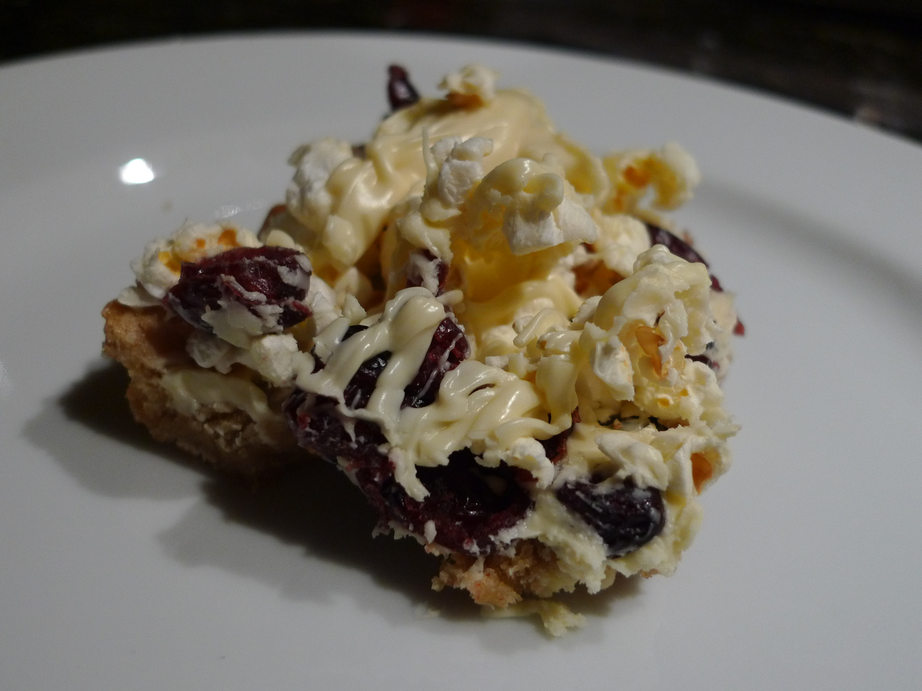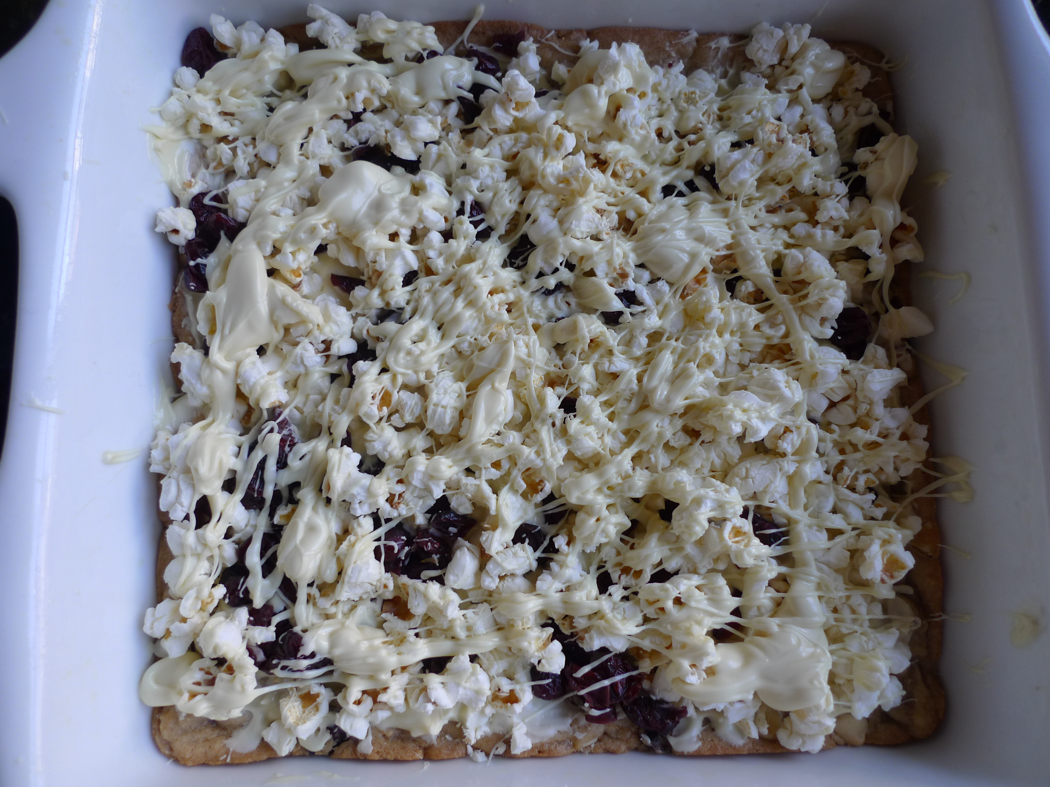 Spoon batter into prepared pan and smooth top. Bake until just cooked through and golden brown, about 20 minutes. Set aside for 5 minutes (but you want to work with it still warm so topping will stick). Melt remaining white chocolate. Spread 2/3 of the melted chocolate over bars and immediately scatter remaining cranberries and popcorn over the top, pressing down gently to help stick. Drizzle remaining chocolate over bars. Set aside until chocolate sets, about 15 minutes. Cut into squares and serve. Store in a sealed container for a few days.